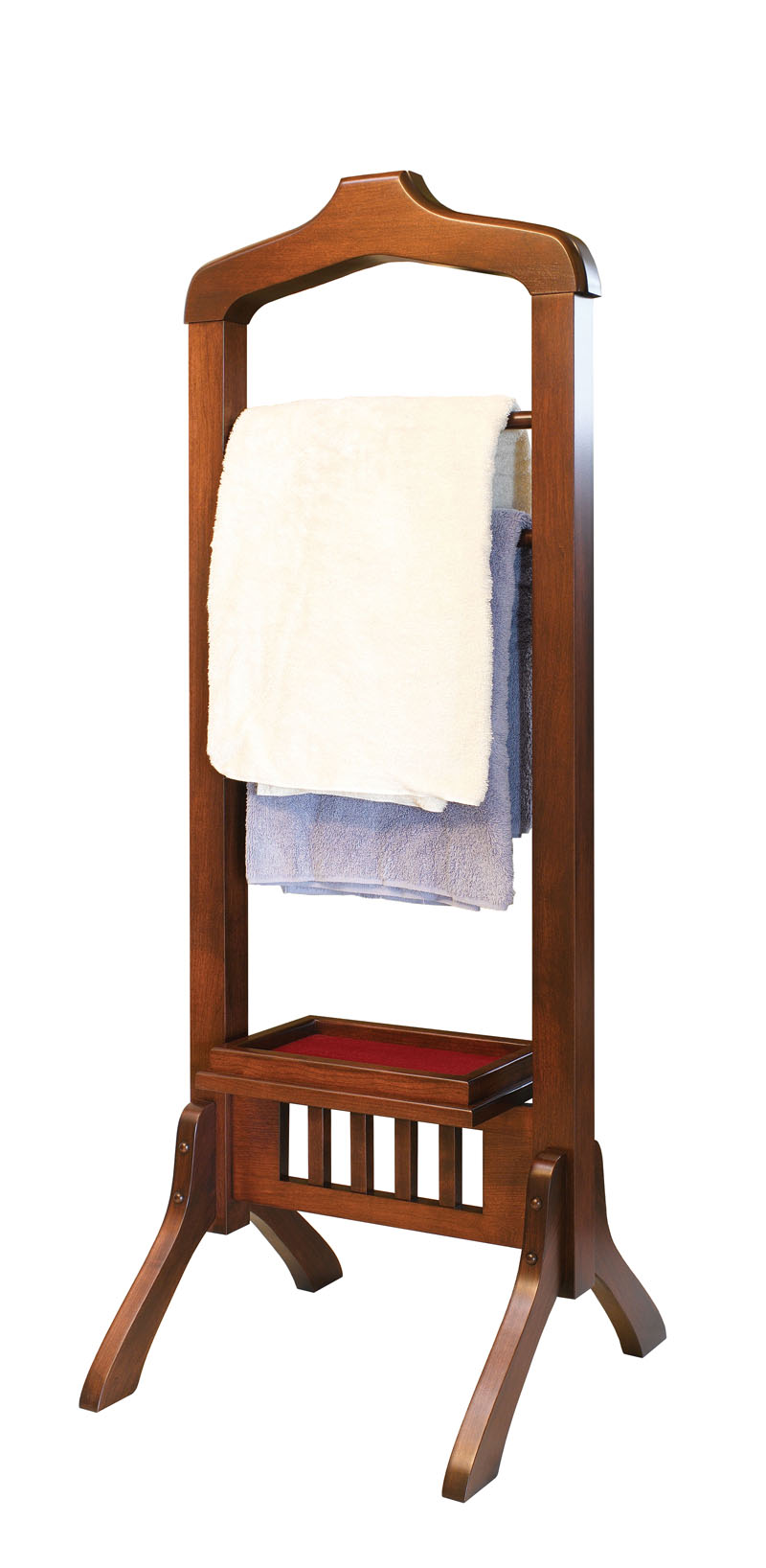 What was once known as a Men's Valet can also be used in a bathroom to hold a bathrobe and towels or simply to display scarves for her. What makes this Valet unique is that it is built out of solid hardwood which allows you to match your existing Bedroom, Office, or Bathroom. The hanger is 2" thick which maintains a nice body for your suit coat or sports coat and is designed not to leave hanger marks. The pants, ties, and scarf rods are ¾" round to eliminate creasing.